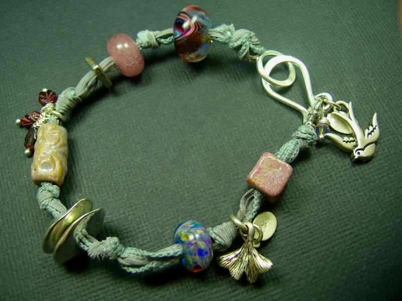 | Description: | An eclectic collection of 5Fish Lampwork beads, Sterling silver, handmade ceramics, garnet stones, Swarovski crystals. Hand knotted on hand dyed Habotai silk with Sterling hook closure. |