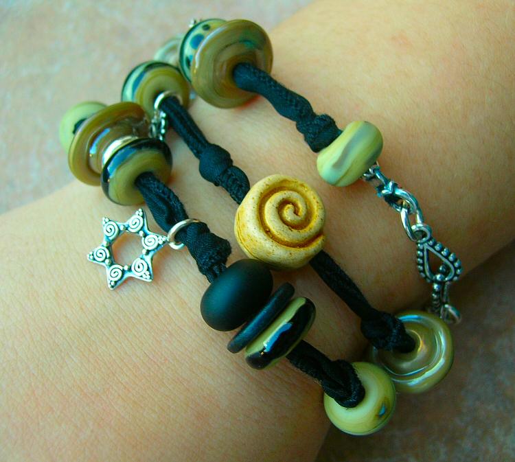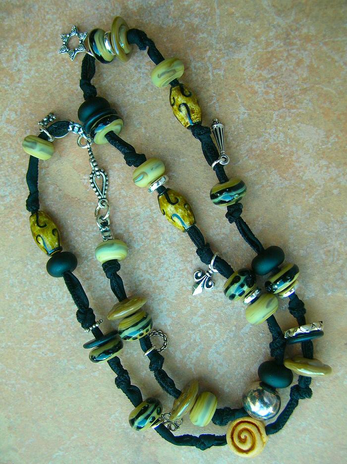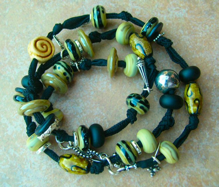 A fun combination of Italian Murano beads handknotted with Sterling charms and closed off with a Sterling hook clasp on Hand Dyed Pure Silk Ribbon. This piece is SO versatile-wear it as a 24 inch necklace (so cool going casual with jeans!) or triple it up on your wrist as a bracelet! I love this style, I wear mine all the time! It is so comfortable, doesn?t feel like it?s there at all but you WILL get compliments! There is a little stretch and beautiful drape to this durable strong fabric, it will fit *most*. This is for ONE piece, not a combo of necklace and bracelet as two separate entities-the pictures are a representation of the versatility of this design. |